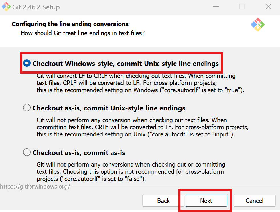 - Checkout일 때는 윈도우 스타일(CRLF), Commit일 때는 Unix 스타일(LF)로 처리