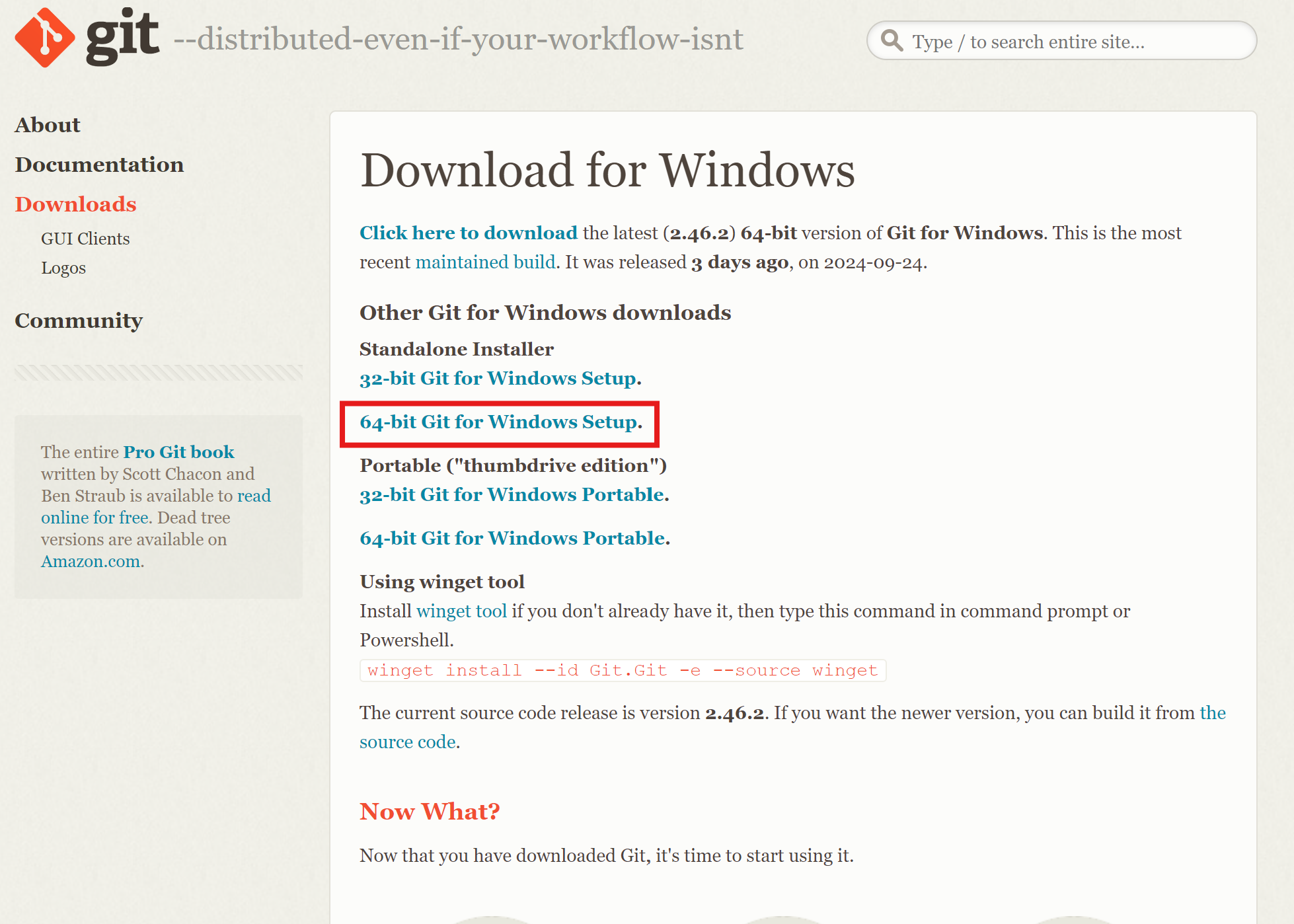 우선 GIT 공식 홈페이지에서 윈도우 버전을 다운로드 받습니다.