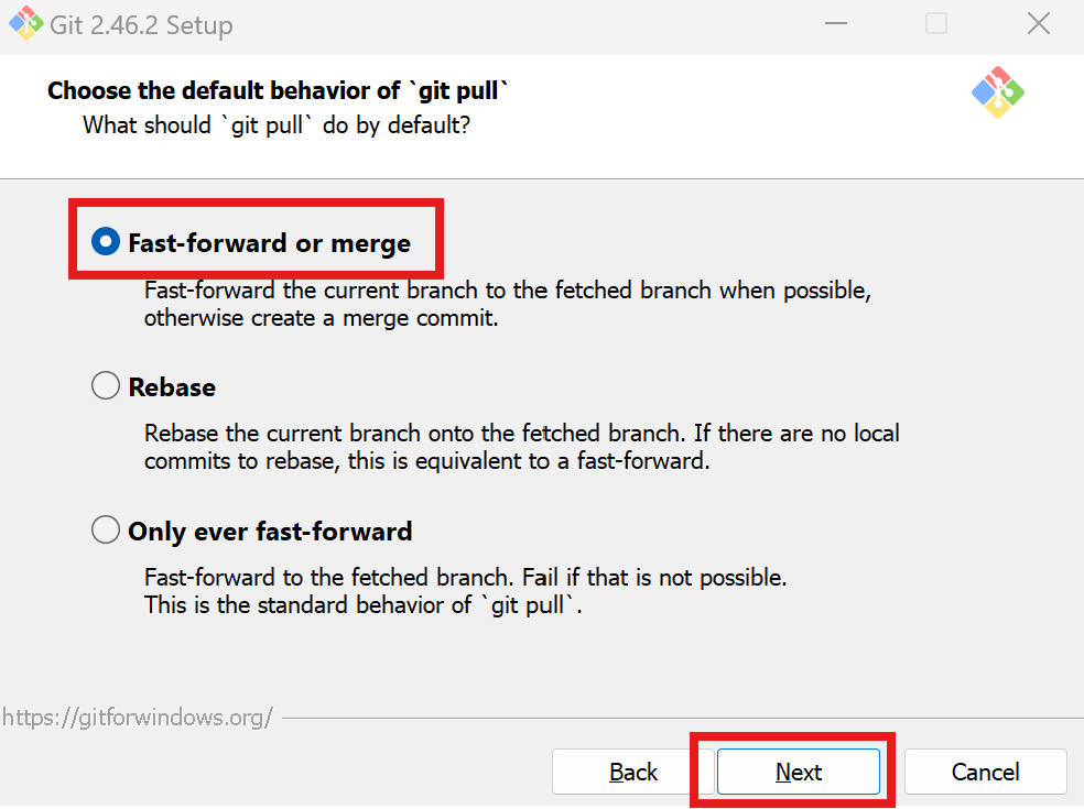 git pull 명령을 실행할 때 수행될 작업을 선택하는 창입니다.