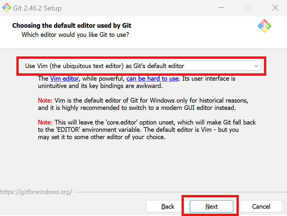 GIT 기본 편집기(Git's default editor) 선택 후 Next 클릭