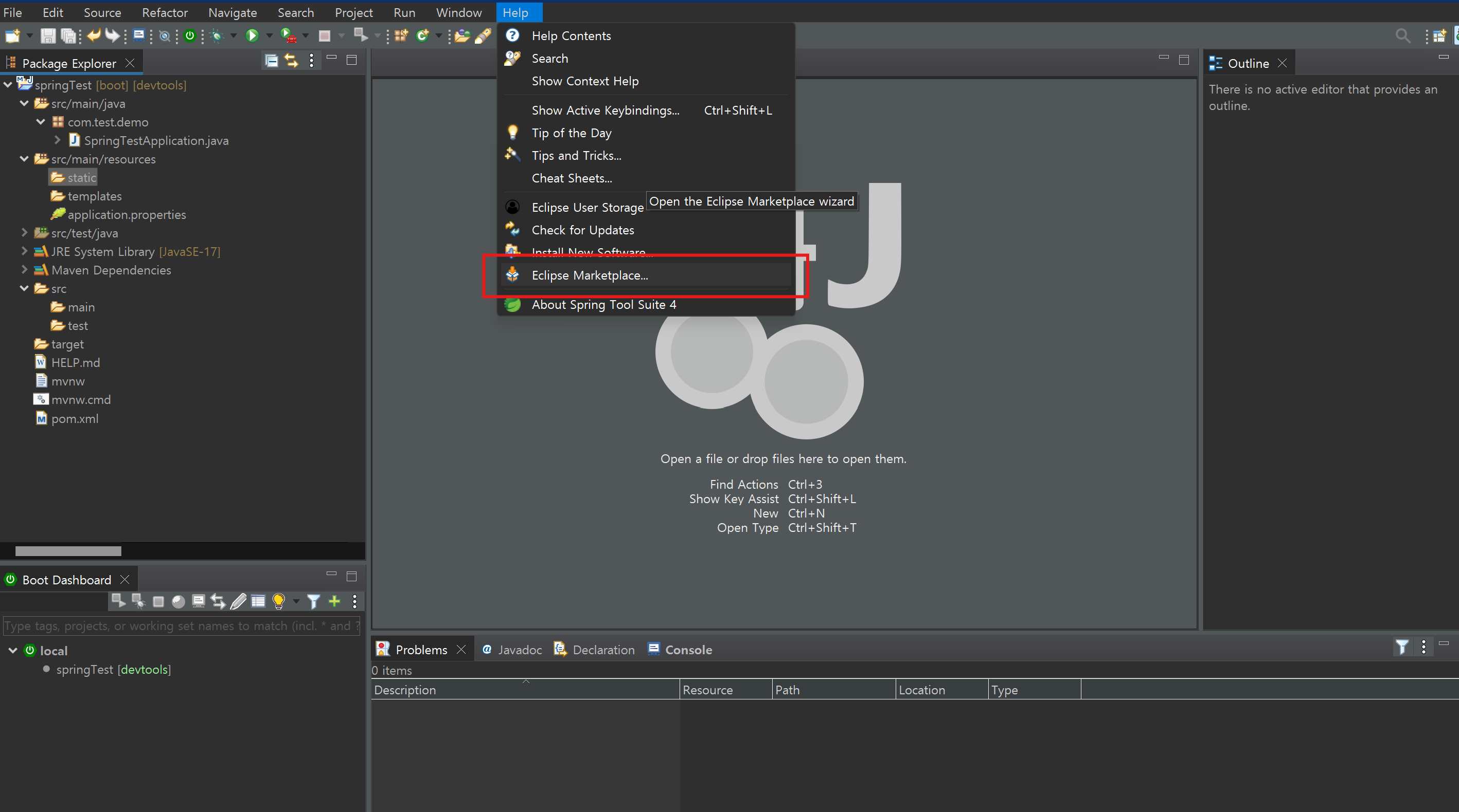 이럴땐 당황하지 않고 STS4 상단 메뉴에 Help -> Eclipse Marketplace... 를 클릭합니다.