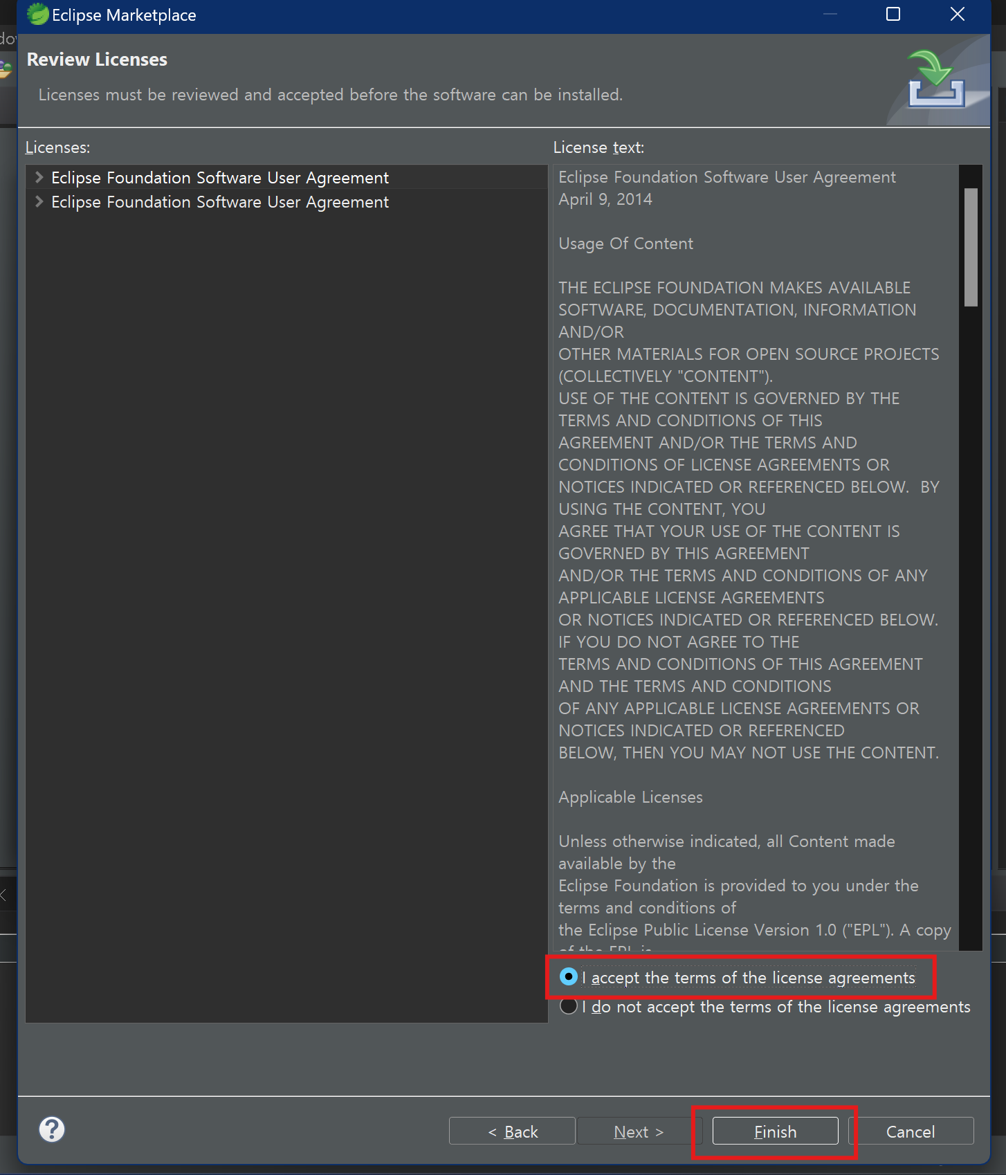 다운로드 창이 뜨면 'Confirm' -> 'I accept the terms ~' -> 'Finish' 순으로 클릭해주세요.