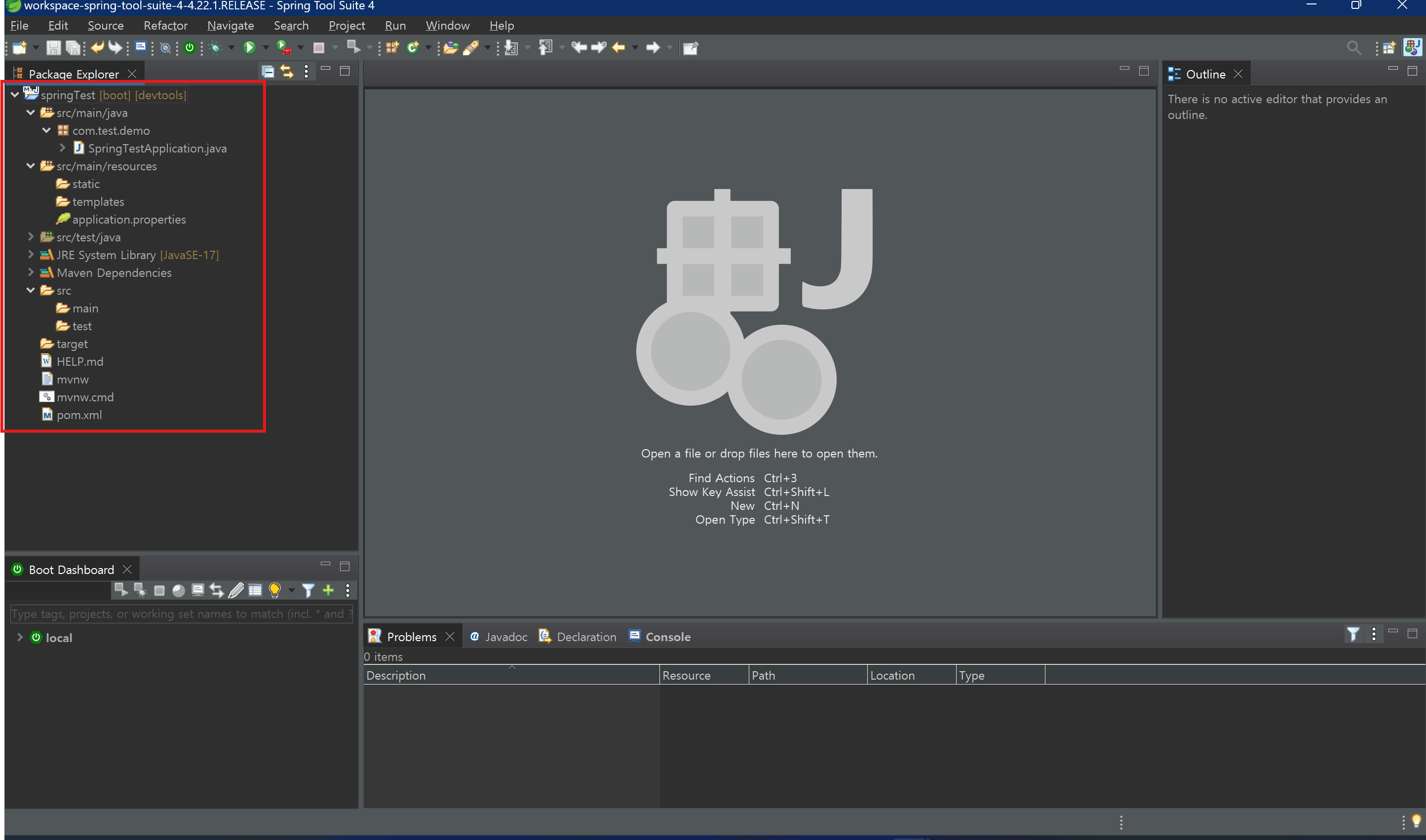저장한 다음 왼쪽 하단에 Boot Dashboard 창에 springTest가 있을텐데요.