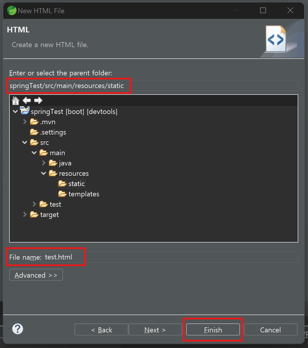 폴더 경로 확인해주시고, File Name은 test.html로 변경해준뒤 Finish를 클릭해주세요.