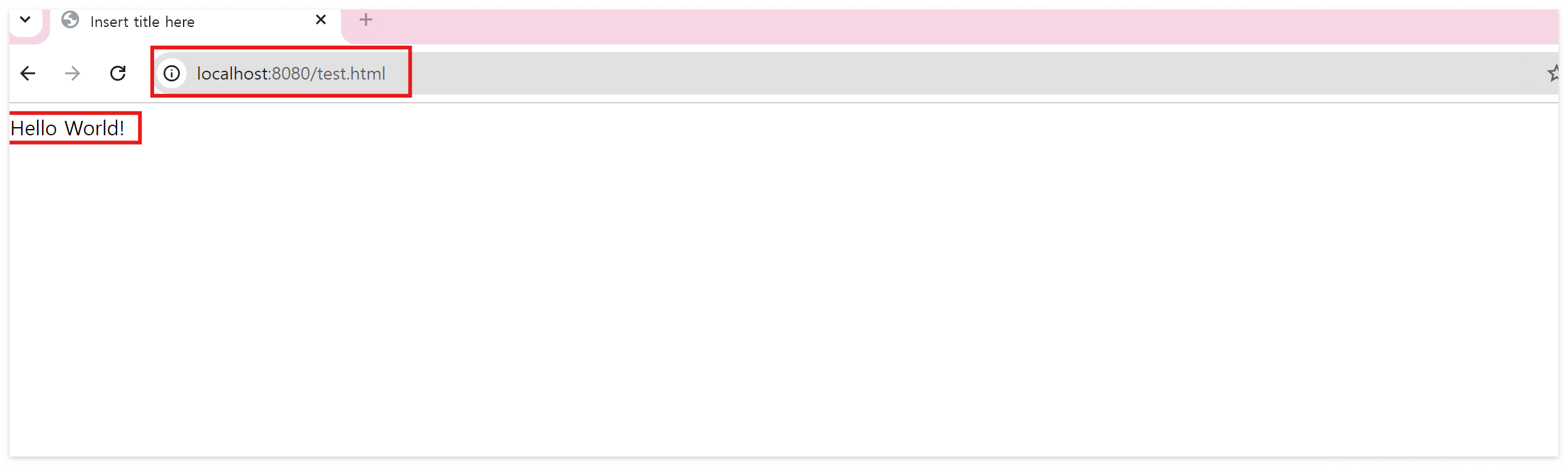 확인이 됐다면 인터넷 브라우저를 열고, 주소창에 'localhost:8080/test.html' 을 입력하면 작성한 Hello World가 나오는걸 확인할 수 있습니다!