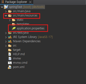 src/main/resources 폴더 밑에 application.properties 파일이 있는데요. 더블클릭해서 파일을 열어줍니다.