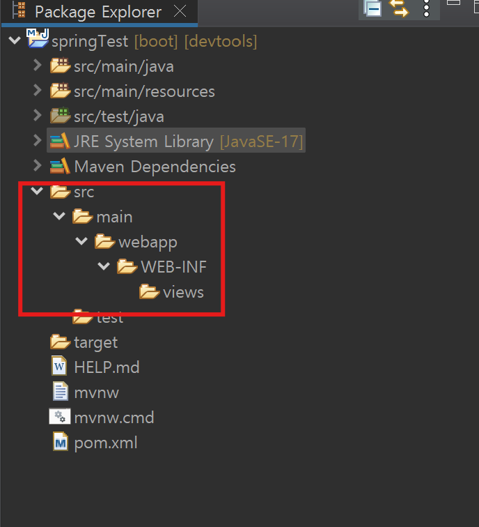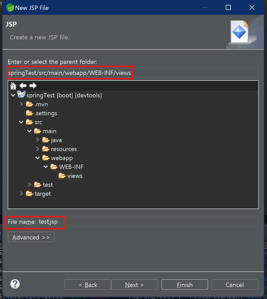 이제 views 폴더에 test.jsp 파일을 만들어줍니다.