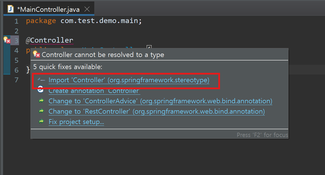 빨간색 줄 위에 마우스를 올려보면 'Import 'Controller' (org.springframework.stereotype)' 이라는 문장이 보일겁니다.