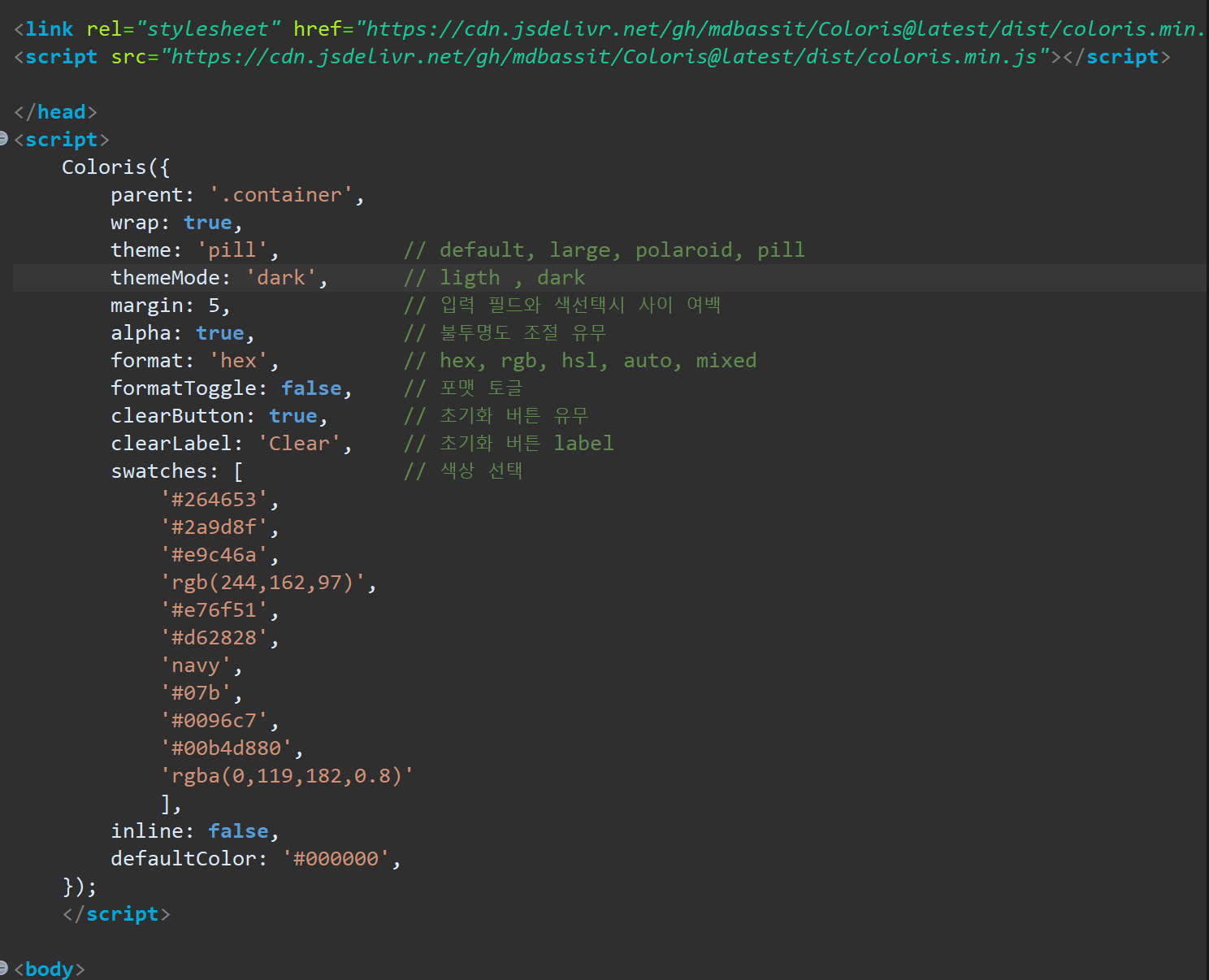 주석으로 설명을 써놨으나 더 자세한 설명이 필요하다면 https://coloris.js.org/ 페이지에서 확인 할 수 있습니다.